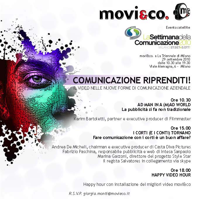 Mercoledì 29 settembre dalle h 10.30 alle h 19.30 presso La Triennale di Milano movi&co organizza una giornata dedicata al video nelle nuove forme di comunicazione aziendale. Una giornata culturale che vuole stuzzicare l’interesse nei confronti dell’audiovisivo come efficace alternativa di comunicazione.